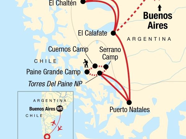 Laguna de los Tres full-day guided hike (El Chaltén). Class III rafting. Perito Moreno Glacier guided tour (El Calafate). Torres del Paine NP excursion with porters (3 nts). W Trek. Internal flights. All transport between destinations and to/from included activities. Flights, Hotels (10 nts), camping (3 nts). 13 breakfasts, 4 lunches, 3 dinners